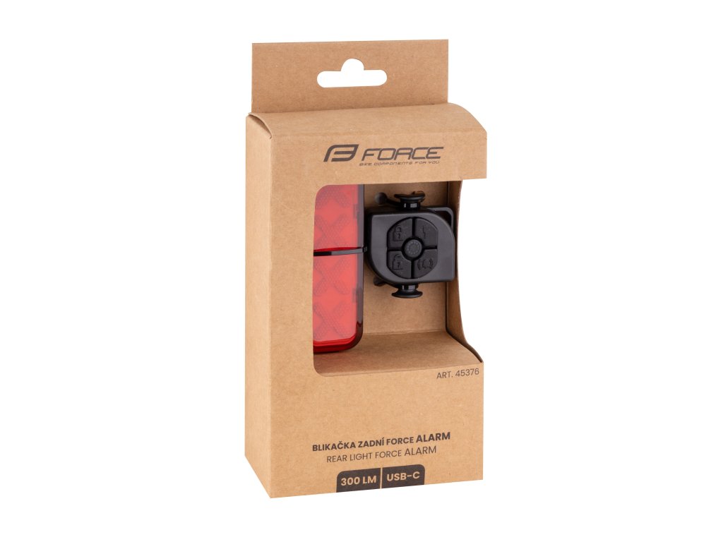 Zadní světlo FORCE ALARM 300 LM je chytrá zadní blikačka s brzdovým senzorem a alarmem. Nejen výrazně zvyšuje vaši viditelnost, ale také zajišťuje bezpečnost díky integrovanému brzdovému senzoru, který při zpomalení automaticky zesílí svit. Vestavěný alarm s pohybovým senzorem ochrání vaše kolo před krádeží a hlasitý klakson upozorní vás a okolí na na nežádoucí manipulaci s vašim kolem. Nabíjení přes USB, pět režimů svícení a snadná montáž dělají z tohoto světla ideálního společníka pro každou jízdu!