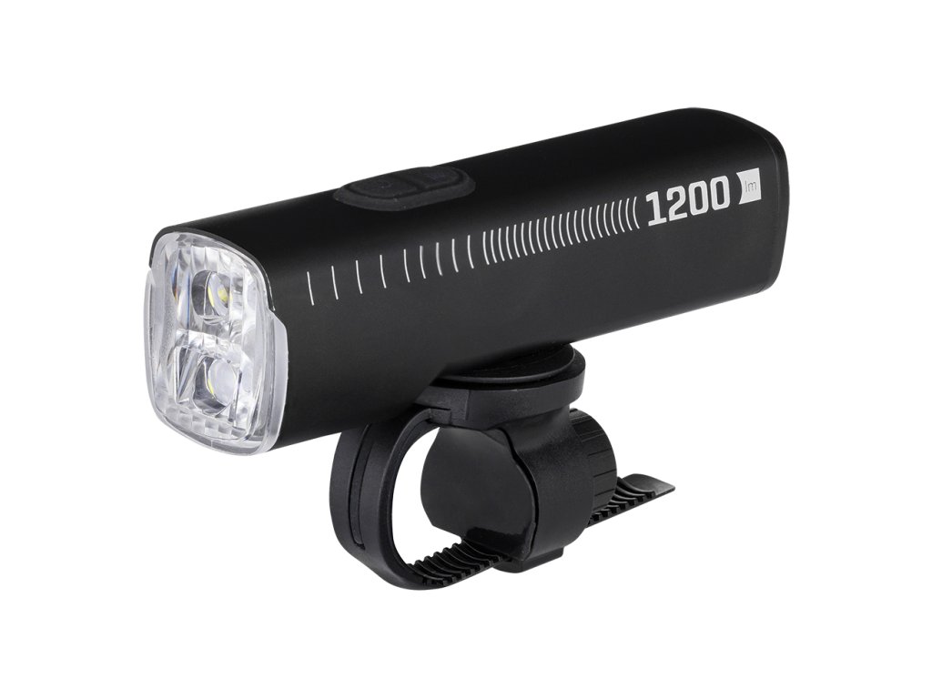 Přední světlo z hliníkové slitiny s maximálním výkonem 1200 LM. Dvě LED – horní a spodní.