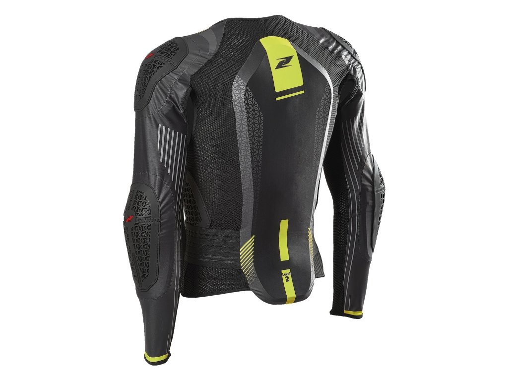 chránič s certifikátem CE úrovně 2 (EN 1621-2) pro záda, (EN 1621-3) pro hruď a žebra, (EN 1621-1) pro lokty